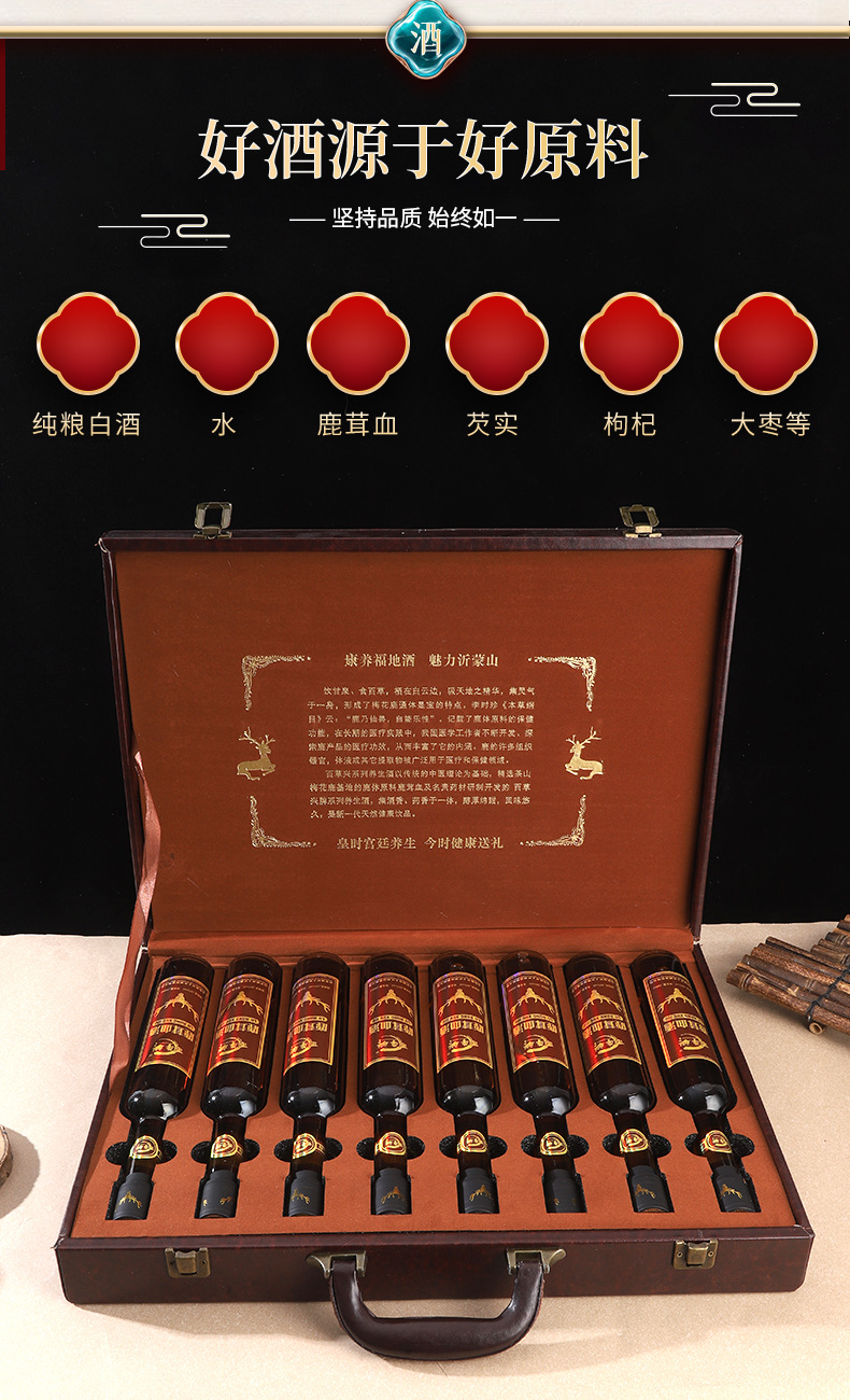 首页 >> 产品中心 >>最新推荐 >> 鹿茸血酒 厂家批发35度鹿茸血酒260ml8瓶配置浸泡鹿茸血酒